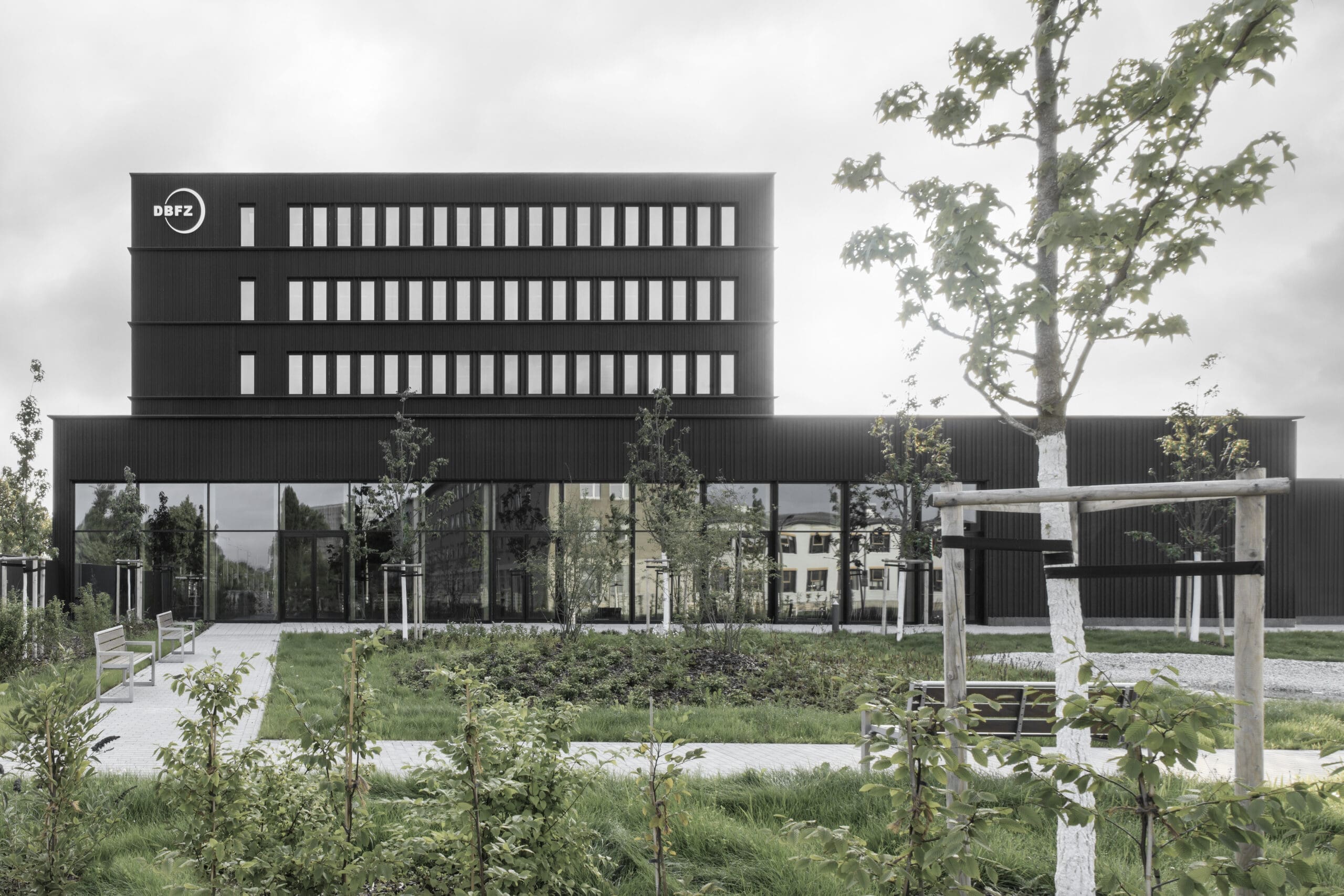 Das Gelände erhält einen ordnenden Rahmen, denn beide Körper werden über ein erdgeschossiges Band aus Labor- und Seminarräumen zu einem Ensemble zusammengefasst. Das Tor im Band trennt öffentlichen Vorplatz und DBFZ-internen Hof. Der neue Vorplatz bildet die Adresse der Forschungseinrichtung und der fünfgeschossige Bürobau mit angegliedertem Konferenzzentrum macht von weitem darauf aufmerksam. Das Logo des DBFZ konnte in der nichtfarbigen Variante vor dem dunklen Holz platziert werden.
