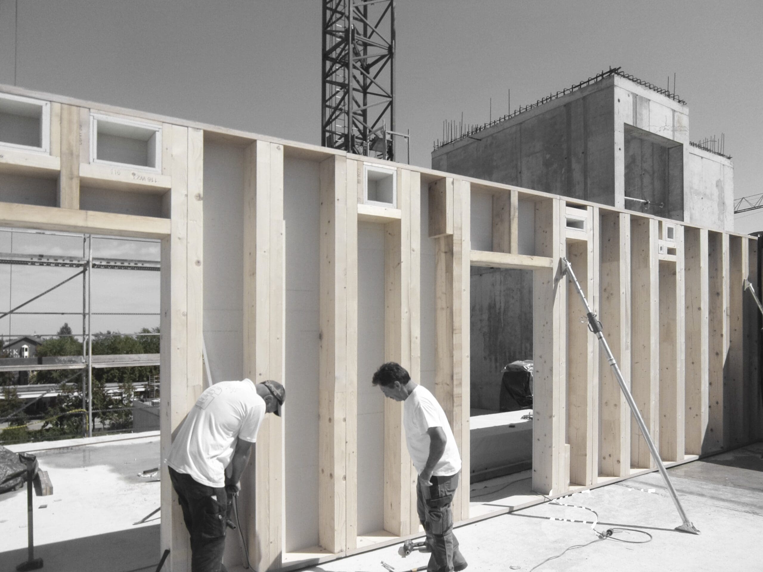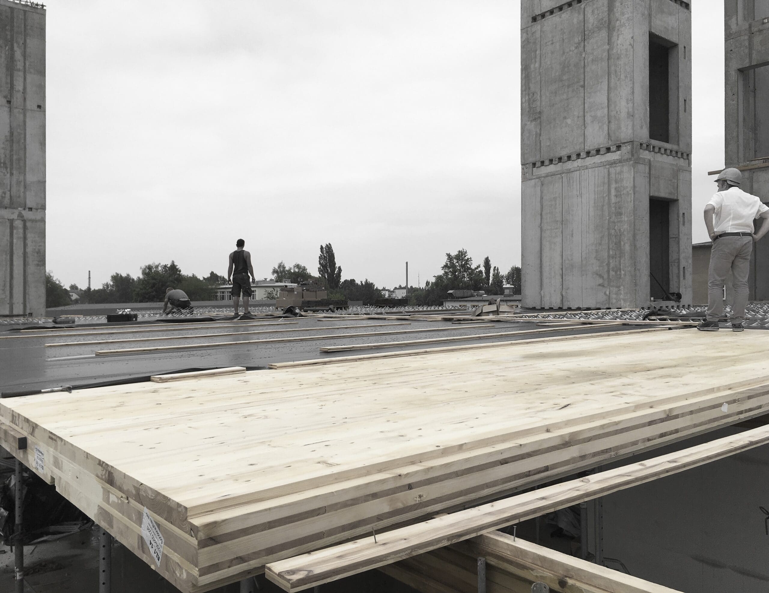 Das Bürogebäude war der erste mehrgeschossige Bau seiner Typologie in Sachsen. Nur die aussteifenden Treppenkerne sind aus Stahlbeton. Die übrige Tragkonstruktion der Geschosse besteht aus Brettstapeldecken, Brettsperrholzwänden und Holzstützen. Die Tragkonstruktionen wurden vorgefertigt, elementiert geliefert und vor Ort pro Geschoss innerhalb einer Woche zusammengesetzt. Wo es der Brandschutz zuließ, blieb die Konstruktion sichtbar. Das gewählte Konstruktionsprinzip eines Rohbaus aus Holz und die Fassadenbekleidung aus Holz weisen energetisch-ökologische Vorzüge auf: Ressourcenschonende Material- und Baustoffverwendung von Holz als nachwachsendem Rohstoff, Steigerung von Raumbehaglichkeit und Arbeitsplatzqualität durch physiologisch positive Wahrnehmung von Holz, schnelle Gebäudeerrichtung durch hohen Vorfertigungsgrad der Holzbauteile und Holz als leicht rückbaubarer und rezyklierbarer Baustoff.