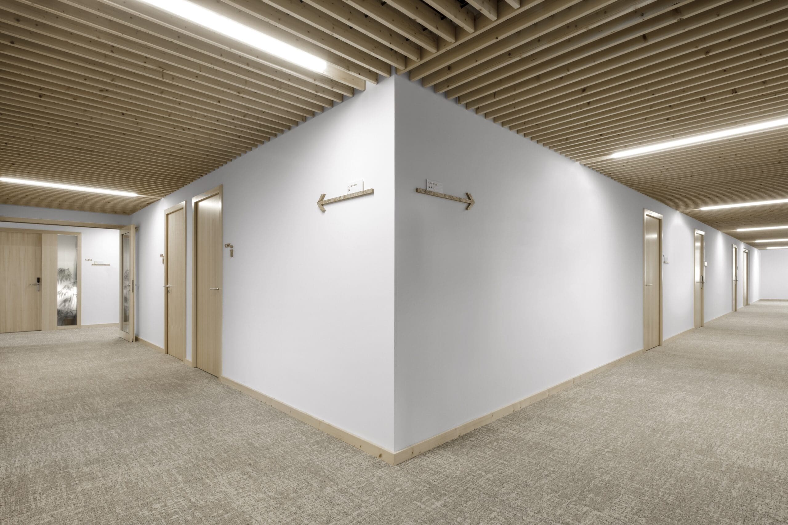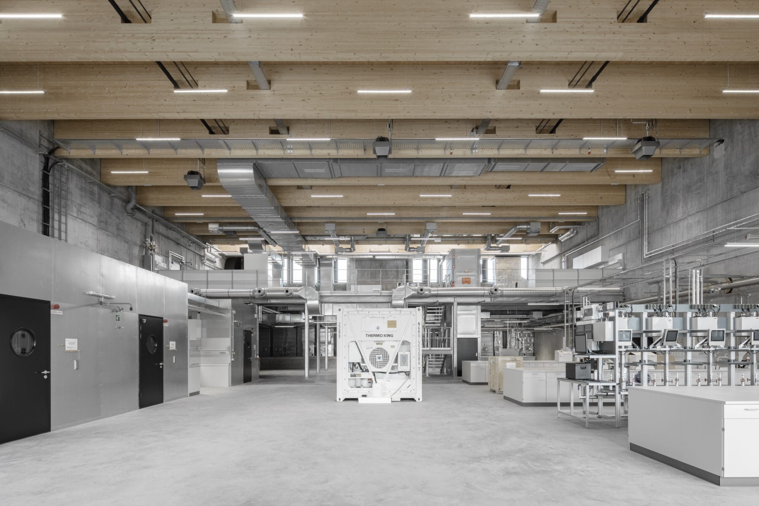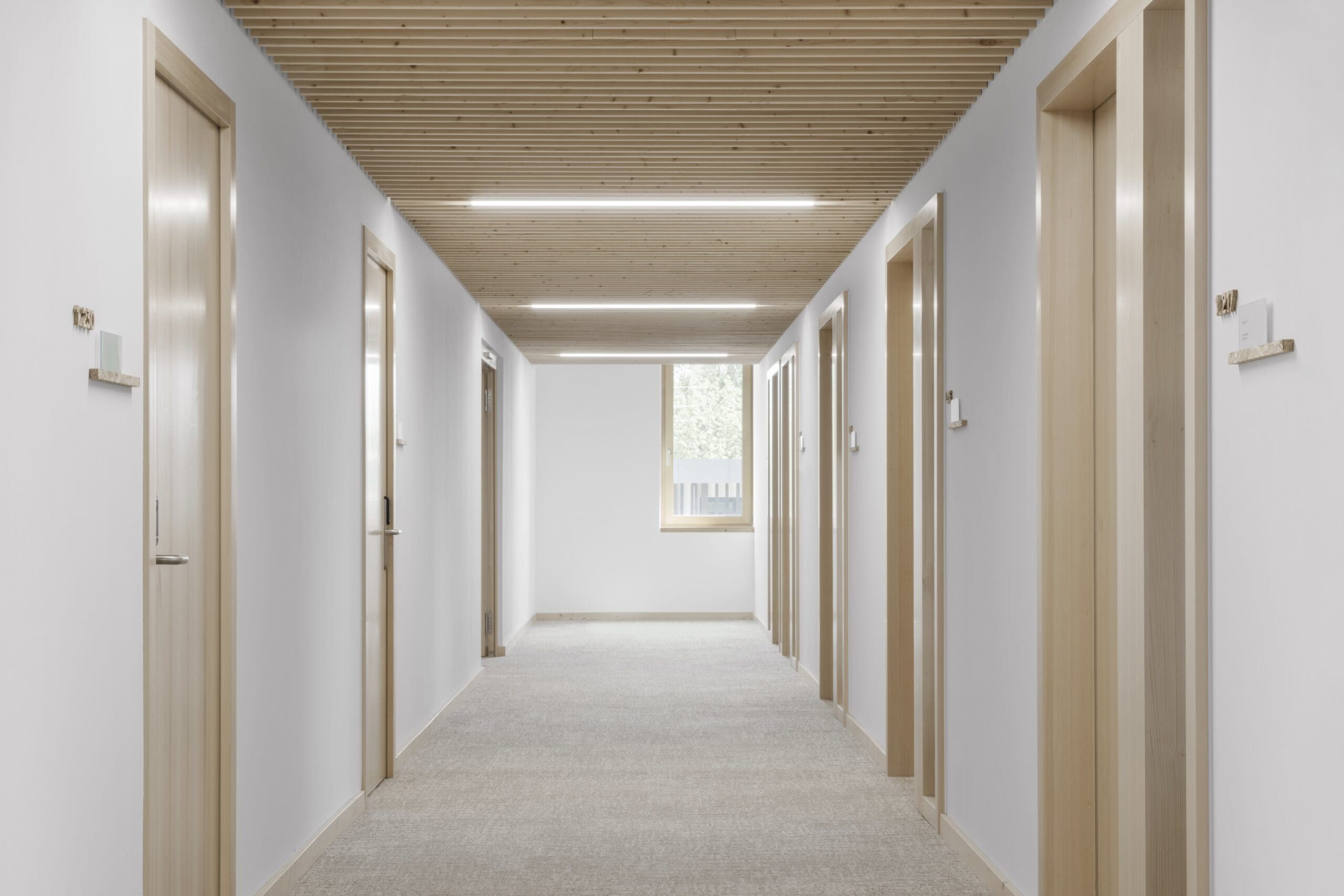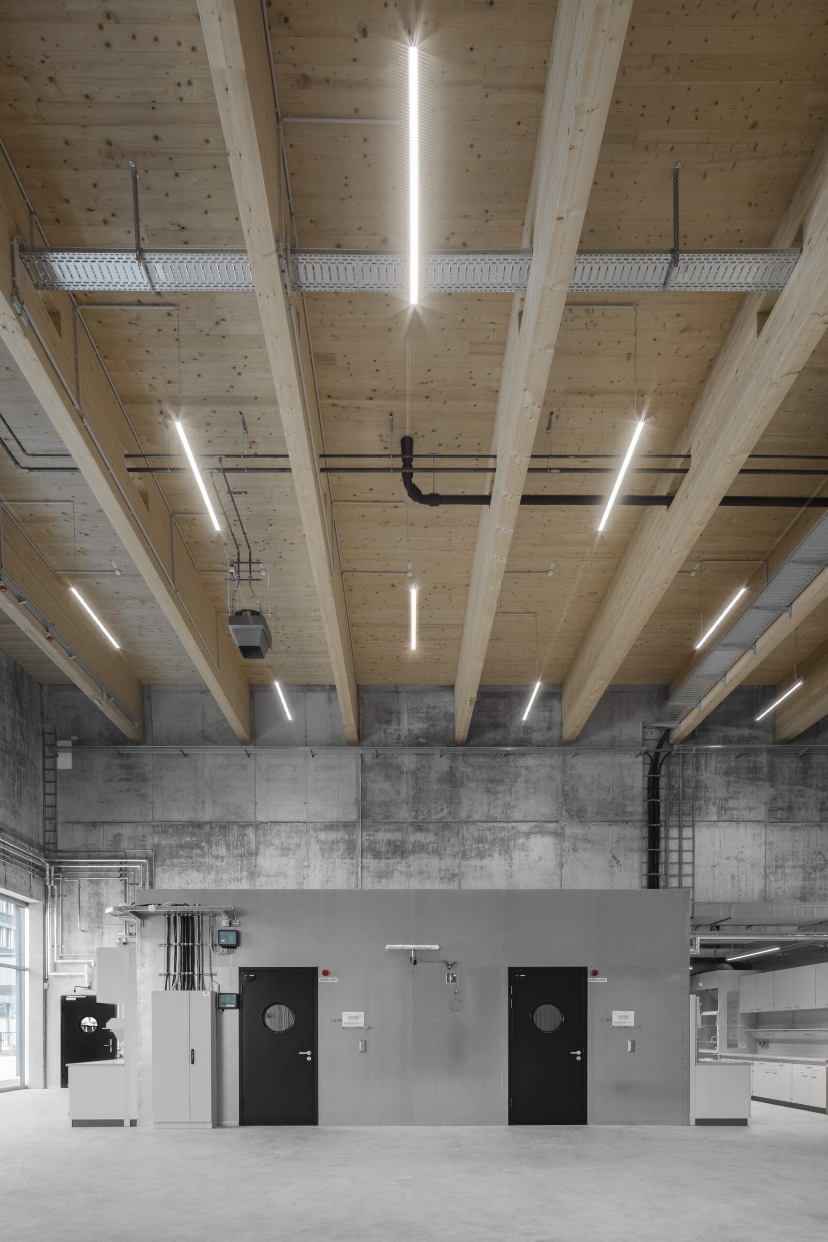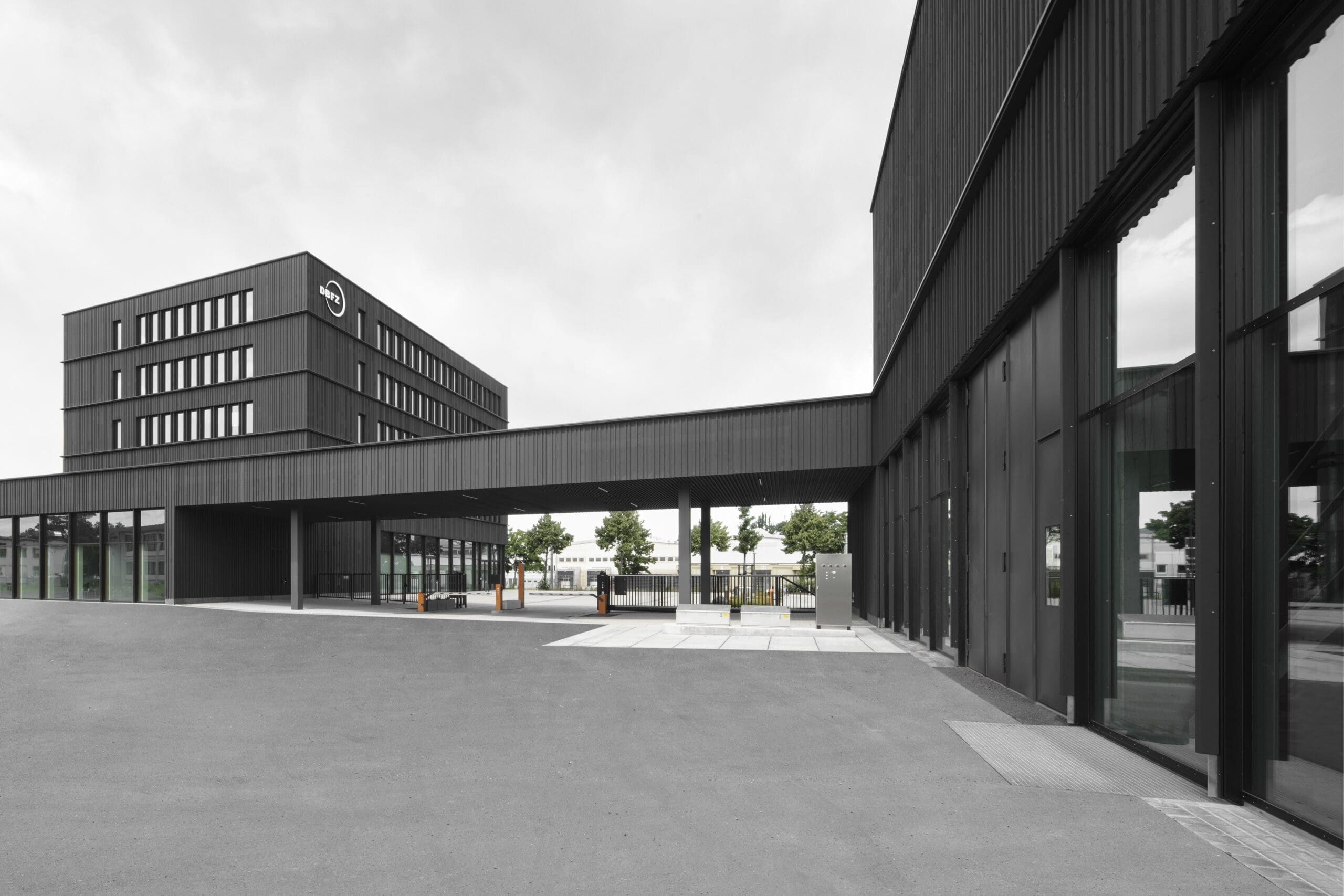 „Holz, soweit das Auge reicht“ ist das Motto des Projekts. Nicht nur die tragende Konstruktion ist weitgehend aus Holz, sondern auch die Gebäudehülle und das Innere weisen einen maximalen Holzanteil auf. So sind alle Fassaden mit unterschiedlich breiten, schwarz angestrichenen Brettern verkleidet.