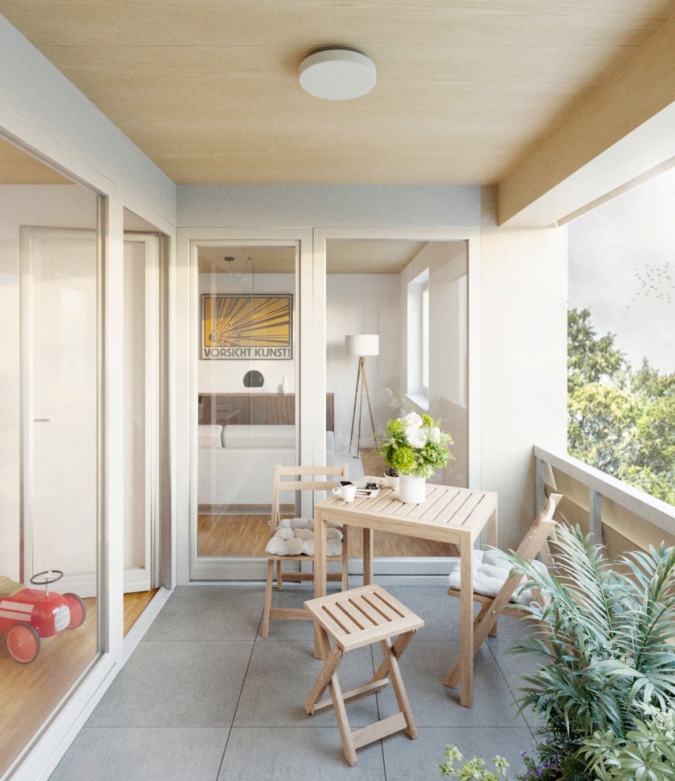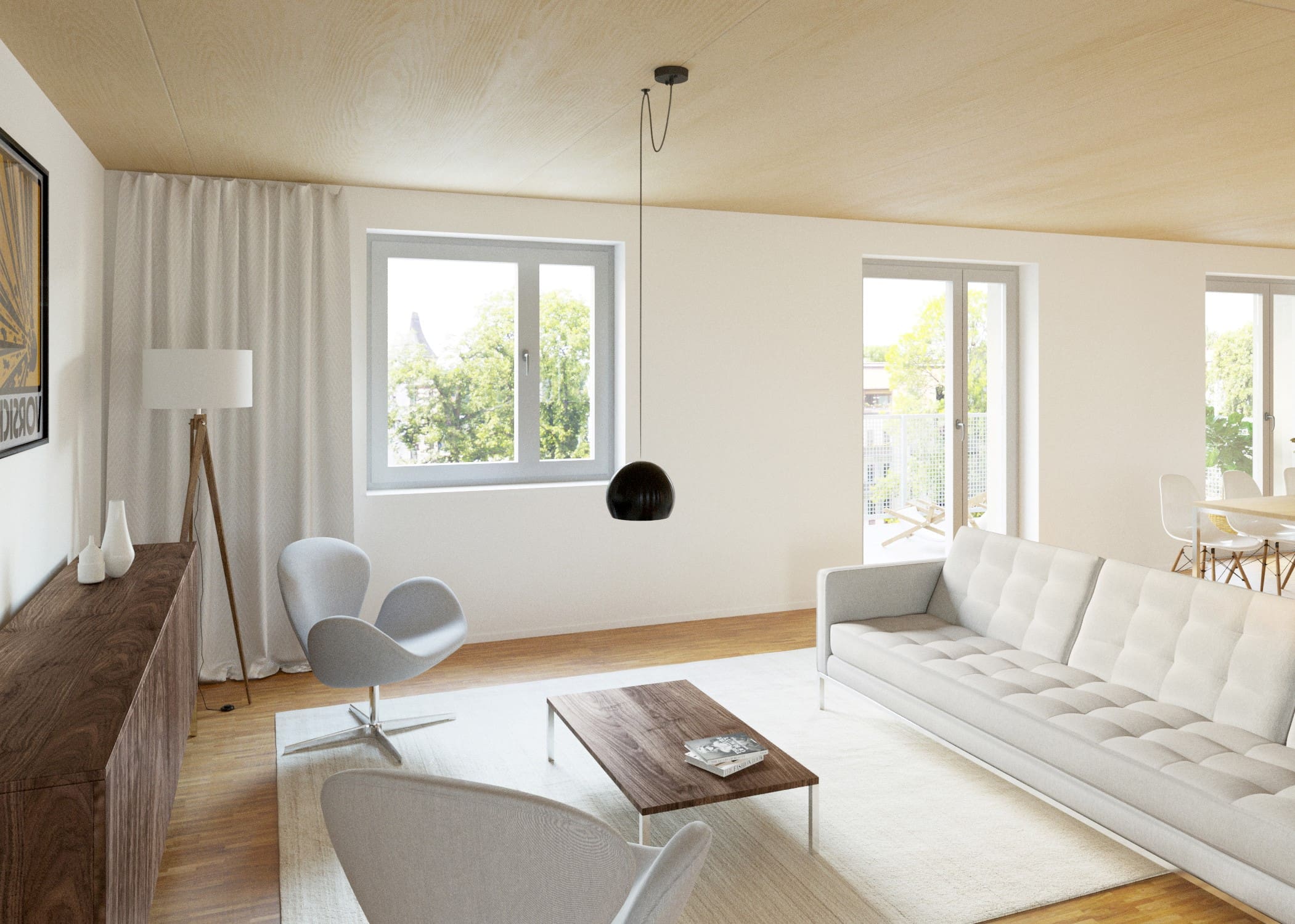 Das Domizil Julius-Krause-Straße 14 ist ein 5-geschossiger Holzwohnungsbau mit einem Satteldach und einer Mittelgarage mit 16 Stellplätzen im Erdgeschoss. Es belegt ein Eckgrundstück an der Kreuzung Julius-Krause-/ Zweenfurther Straße im Leipziger Stadtteil Stünz. Mit Ausnahme des Erdgeschosses, der Brandwände und des Erschließungskerns ist die Konstruktion vollständig in massiven CLT-Elementen ausgeführt. Auf jeder der 4 Wohnetagen befinden sich 6 Wohneinheiten, die teilweise über einen hofseitigen Laubengang erschlossen werden. Das Gebäude verfügt über eine gemeinschaftliche Dachterrasse auf dem nördlichen Gebäudeschenkel. Die streng gerasterte Fassade zur Straße wird als Vorhangfassade mit zementgebundenen Spanplatten ausgeführt, Lisenen verleihen der Fassade eine zusätzliche Plastizität. Neben den CLT-Decken verbleiben innenliegende Holzstützen und -unterzüge holzsichtig.