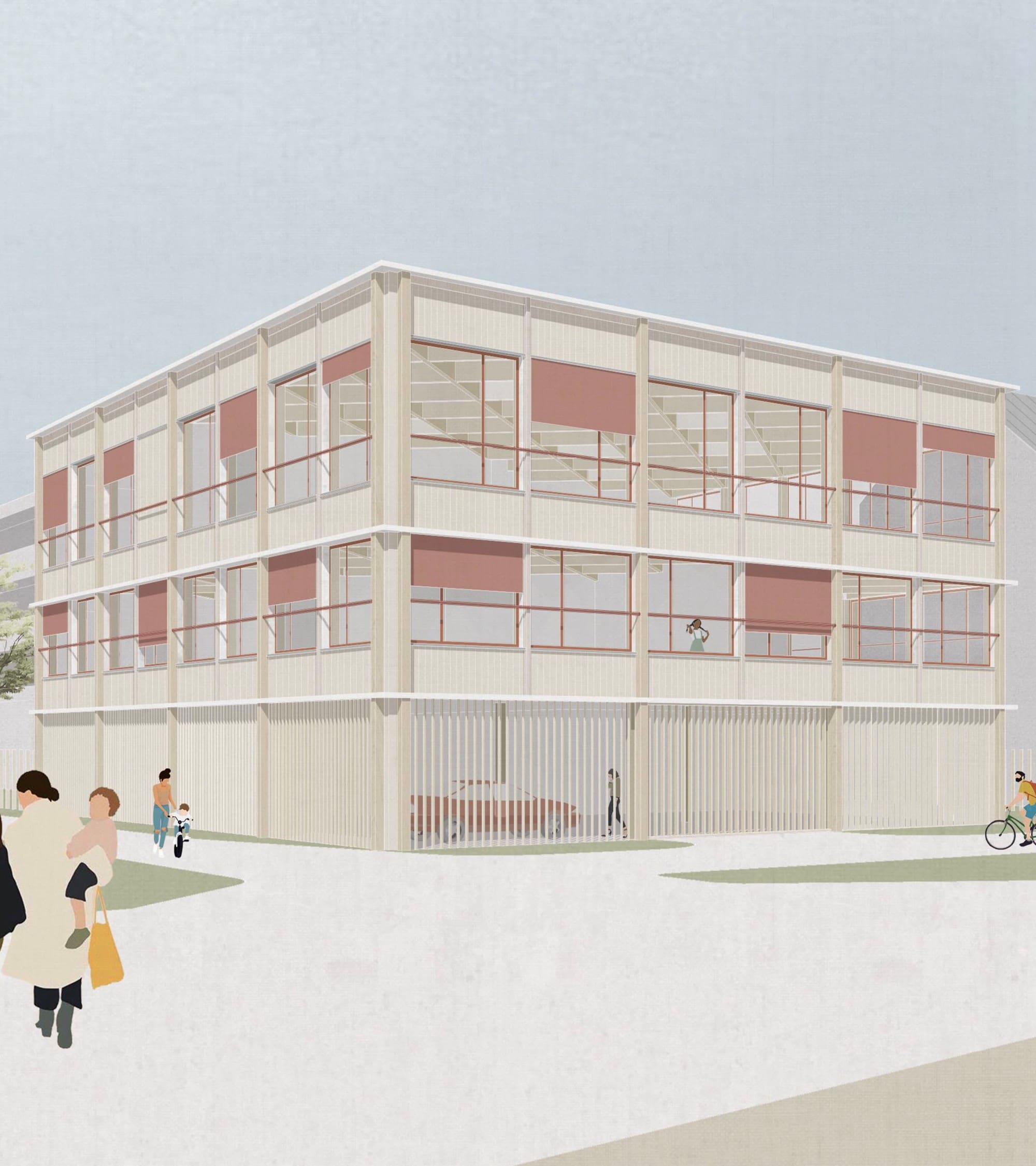 Der Neubau wird als Holzhybridkonstruktion mit einem Holzbauanteil von rund 40 Prozent realisiert. Tragende Elemente aus Brettschichtholz aus Fichte sowie Furnierschichtholz aus Buche bilden gemeinsam mit Brettsperrholzbauteilen die Grundlage der Konstruktion. Ergänzt wird das System durch Holztafelaußenwände in Holzrahmenbauweise, die mit verschiedenen Holzwerkstoffen beplankt und mit einer vorvergrauten Holzlattung aus Fichte bekleidet werden.