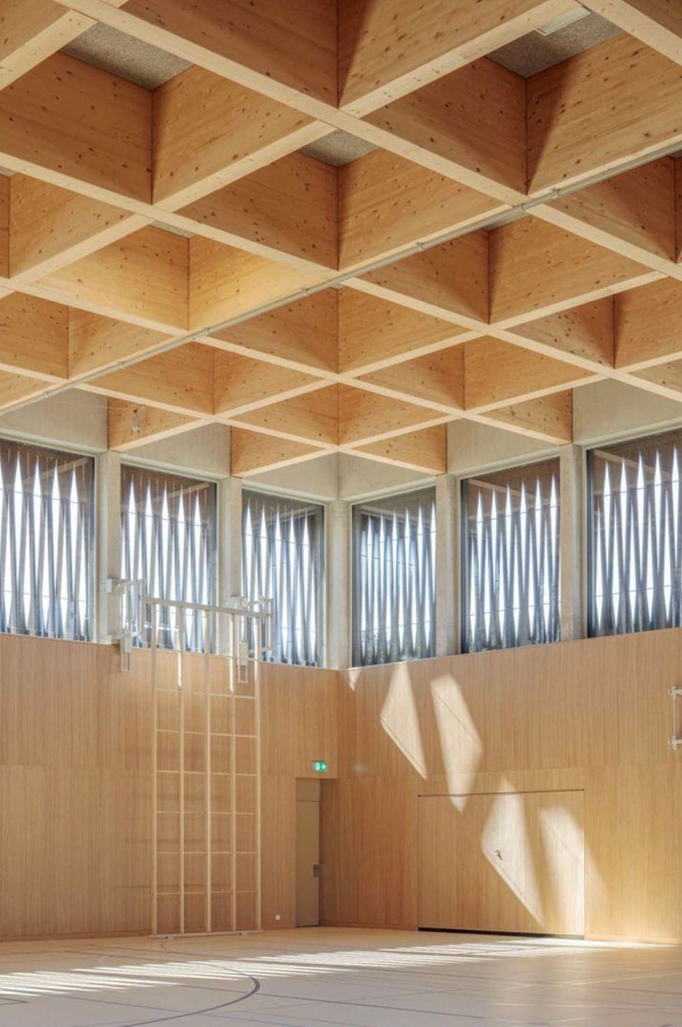 Auch im Innenausbau wird der Baustoff Holz konsequent eingesetzt. Holzfenster sowie Massivholzrahmentüren aus Lärche tragen zur Materialkontinuität bei und unterstreichen den gestalterischen Anspruch des Gebäudes. Die Kombination unterschiedlicher Holzprodukte ermöglicht eine wirtschaftliche, ressourcenschonende und gleichzeitig leistungsfähige Bauweise.