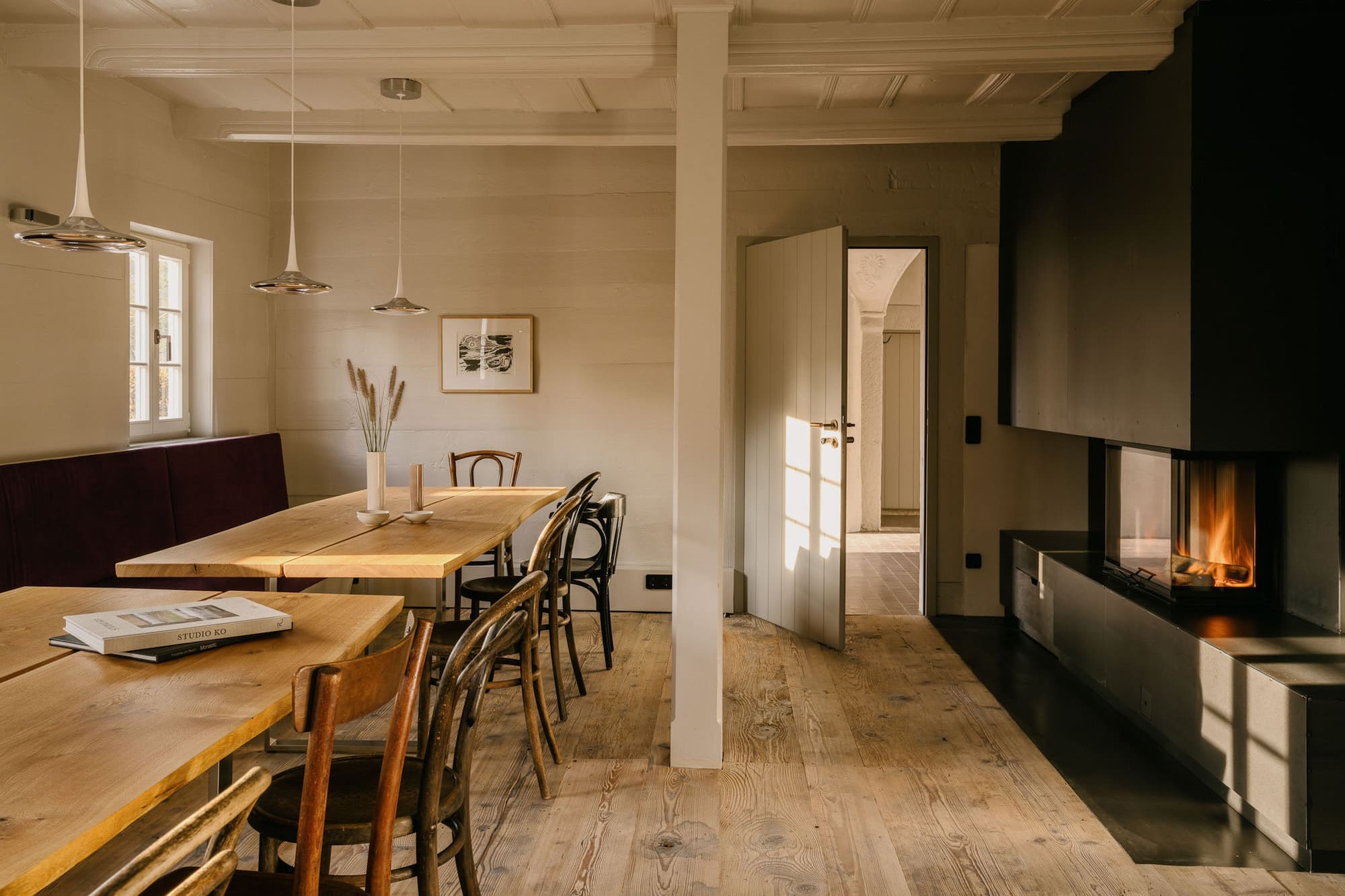Das Erdgeschoss als halböffentlicher Bereich nimmt Foyer, Garderobe, Toiletten und Seminarräume auf. Das Herzstück des gesamten Objektes ist die Blockstube. Diese wurde unter Beibehaltung ihrer historischen Struktur in einen atmosphärischen Gastraum mit offener Küche und Kamin überführt.