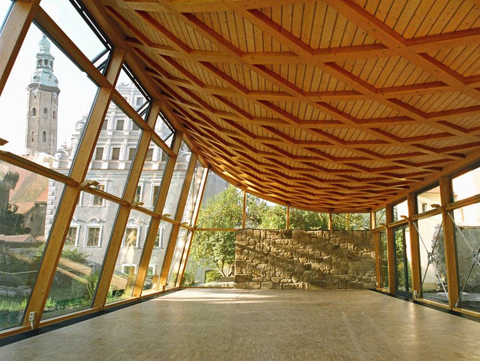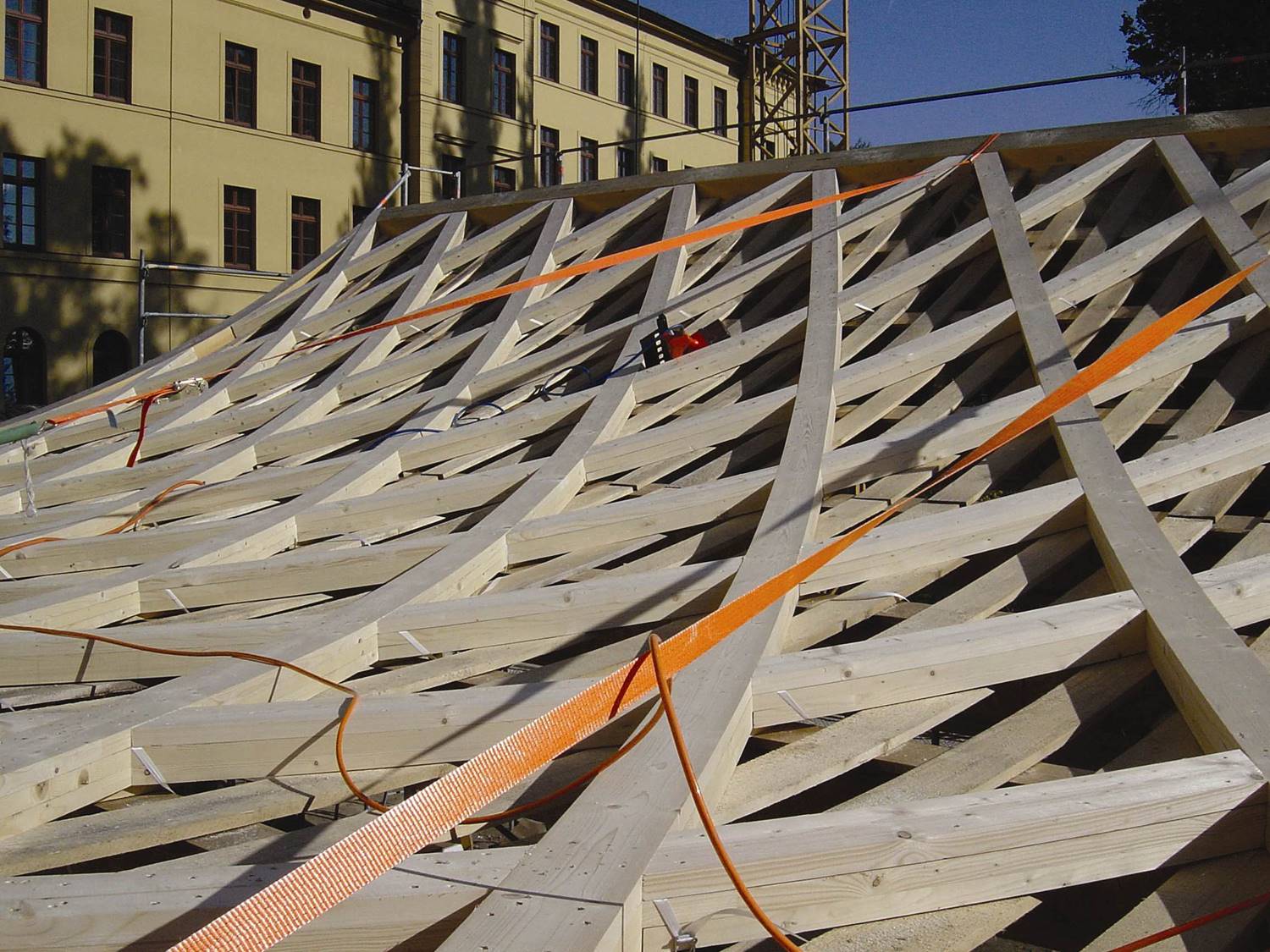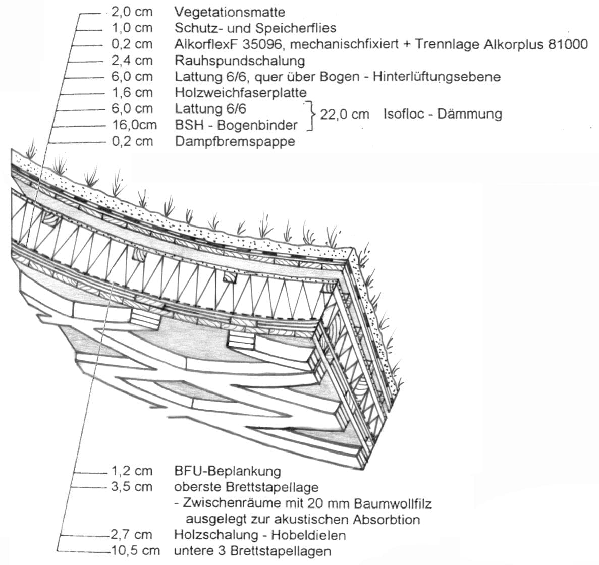 Das beeindruckende Bauwerk zeichnet sich durch eine Holzhängekonstruktion auf rechteckigem Grundriss aus. Besonders hervorzuheben ist die Rauten-Hängekonstruktion aus Holz, die als Flächentragwerk dient und dem Saal eine einzigartige ästhetische Note verleiht. Um dieses eindrucksvolle Gestaltungselement zu schaffen, wurden Fichtenbretter vor Ort über eine Schalung gebogen und miteinander vernagelt.