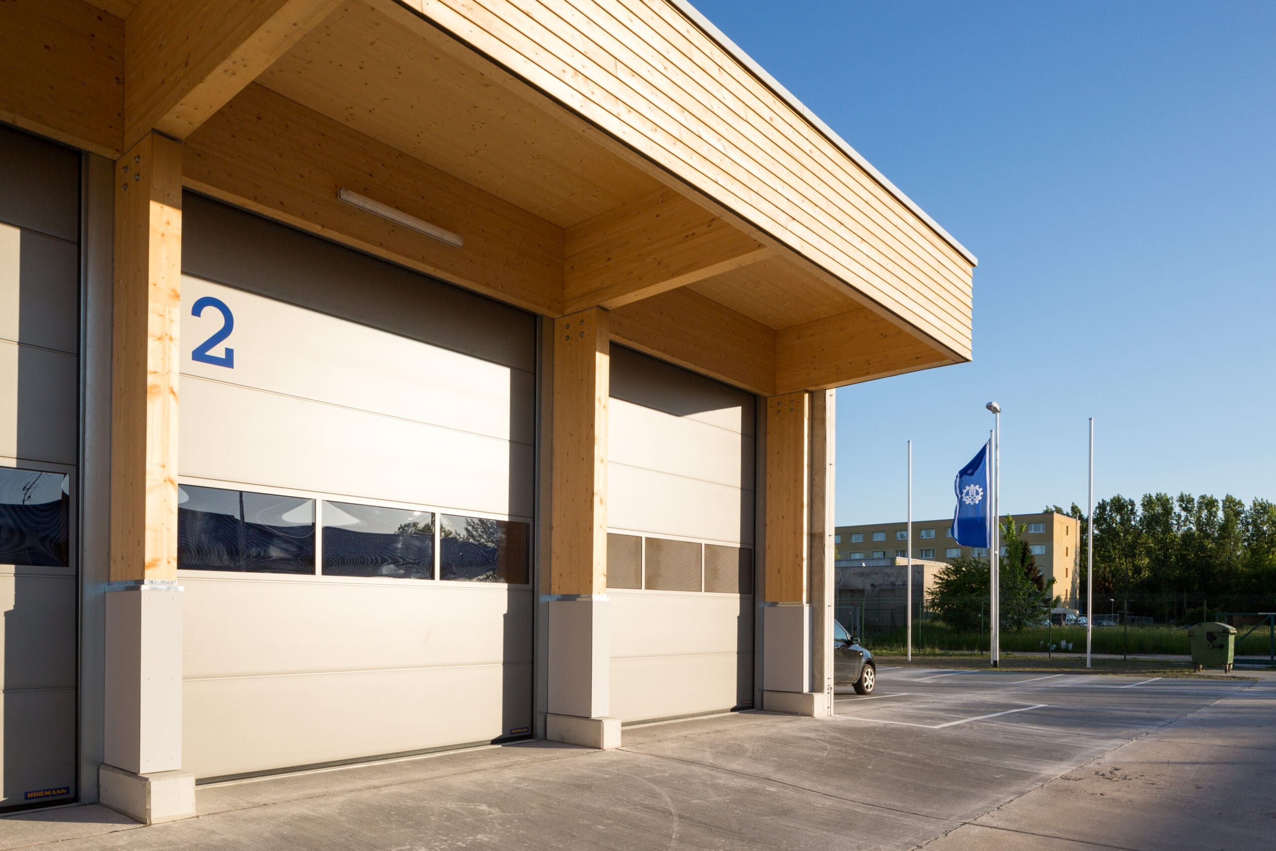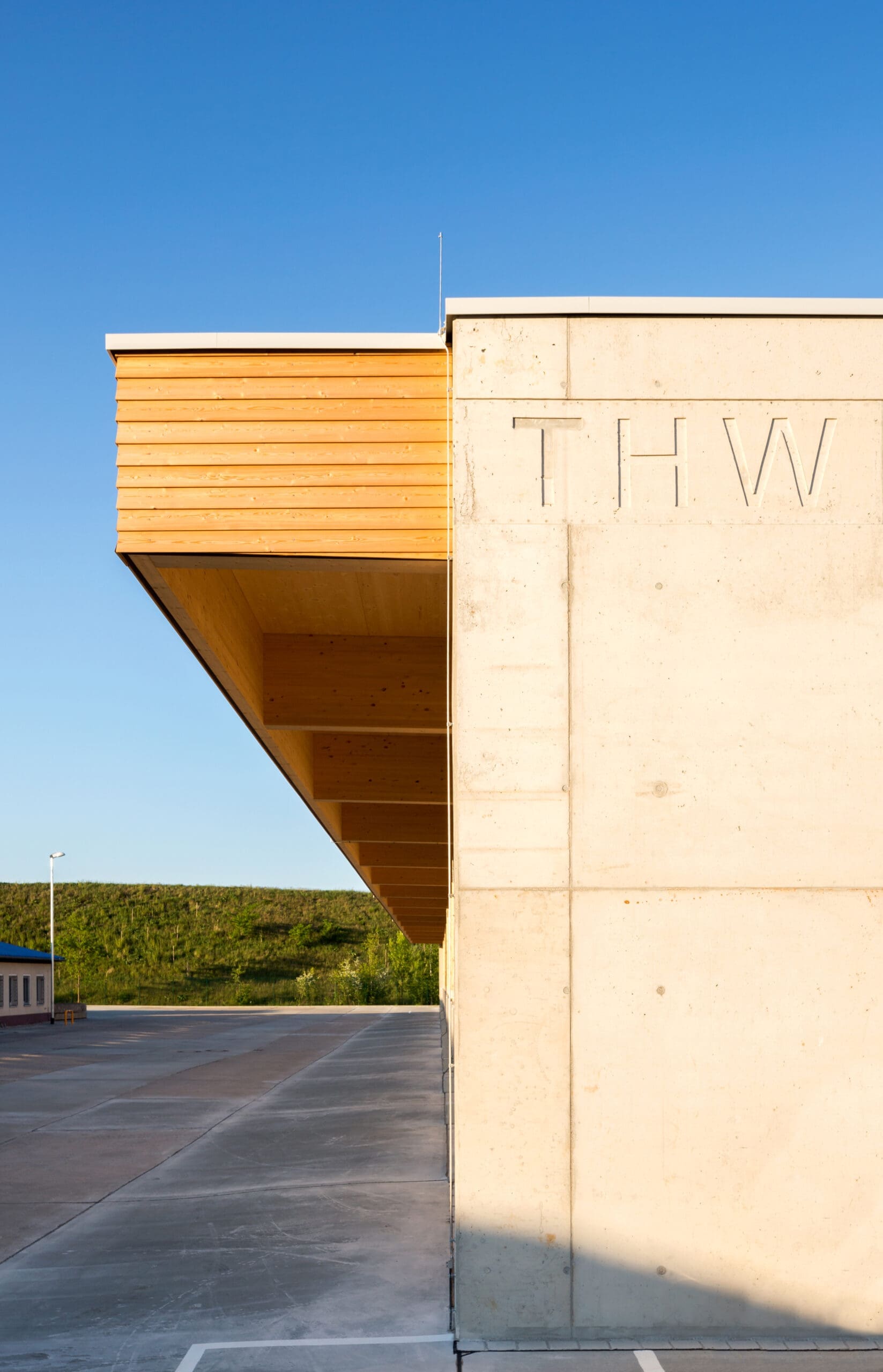 In eine schützende dreiseitige Betonhülle wird die Holzkonstruktion aus Stützen und Trägern eingefügt, die zum Betriebshof mit einem Vordach ausgestattet wird.