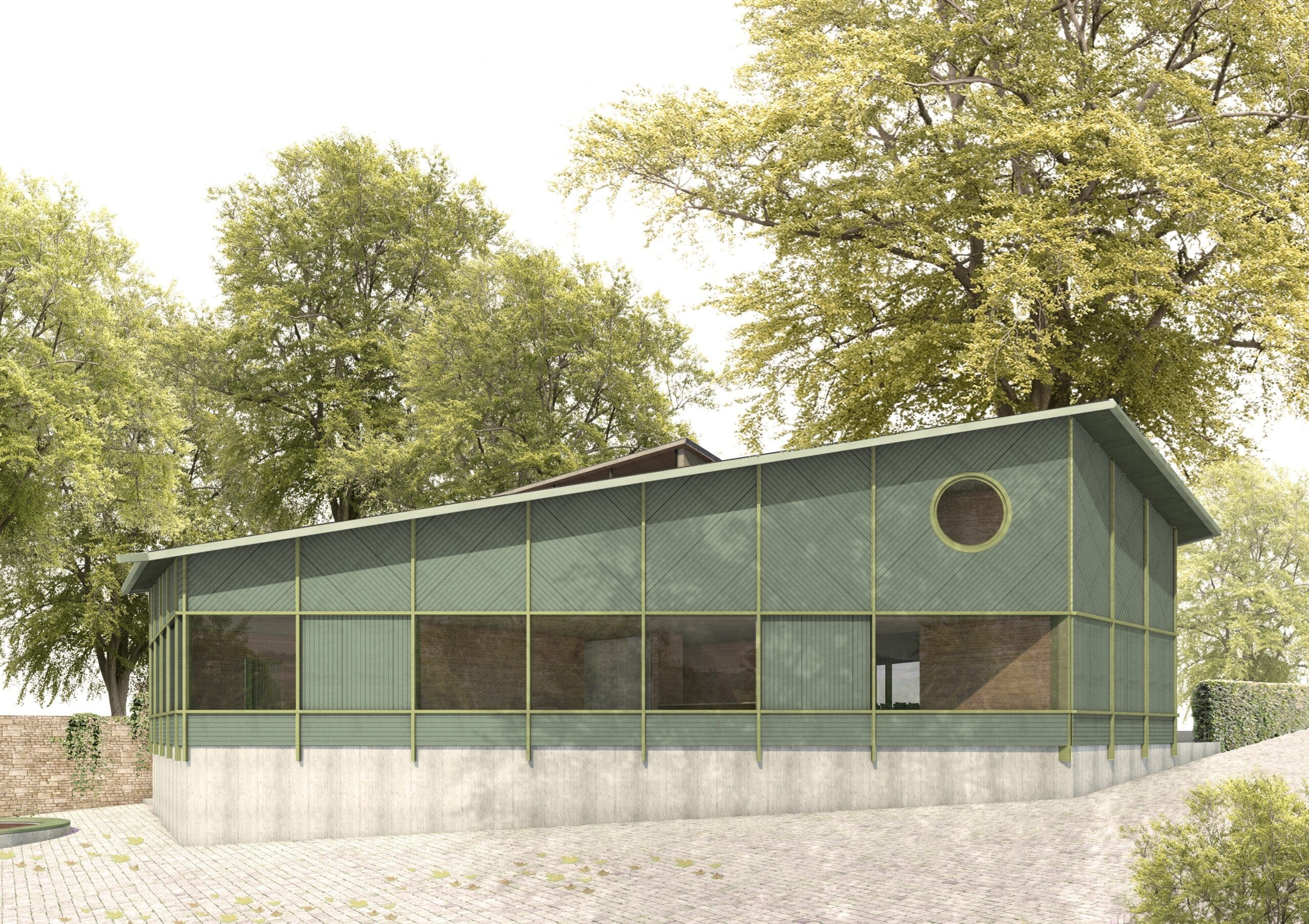 Die Konstruktion ist als Holzständerkonstruktion geplant, das Dachtragwerk als Sparren- oder Pfettendach ausgeführt. Diese Material- und Konstruktionswahl ermöglicht einen hohen Vorfertigungsgrad und damit verkürzte Bauzeiten. Der Nachhaltigkeitsgedanke wird durch die Verwendung heimischer Hölzer zusätzlich gestärkt. In der Fassade wird die konstruktive Struktur sichtbar und prägt den architektonischen Ausdruck des Gebäudes. Holzfenster sowie Wandverkleidungen im Innenraum führen dieses Gestaltungskonzept konsequent fort. Die Bauherrin zeigt damit einen verantwortungsvollen Umgang mit begrenzten Ressourcen und stellt sich aktiv den Themen Transformation und Nachhaltigkeit bei gleichzeitig hohem Anspruch an Qualität und Dauerhaftigkeit.