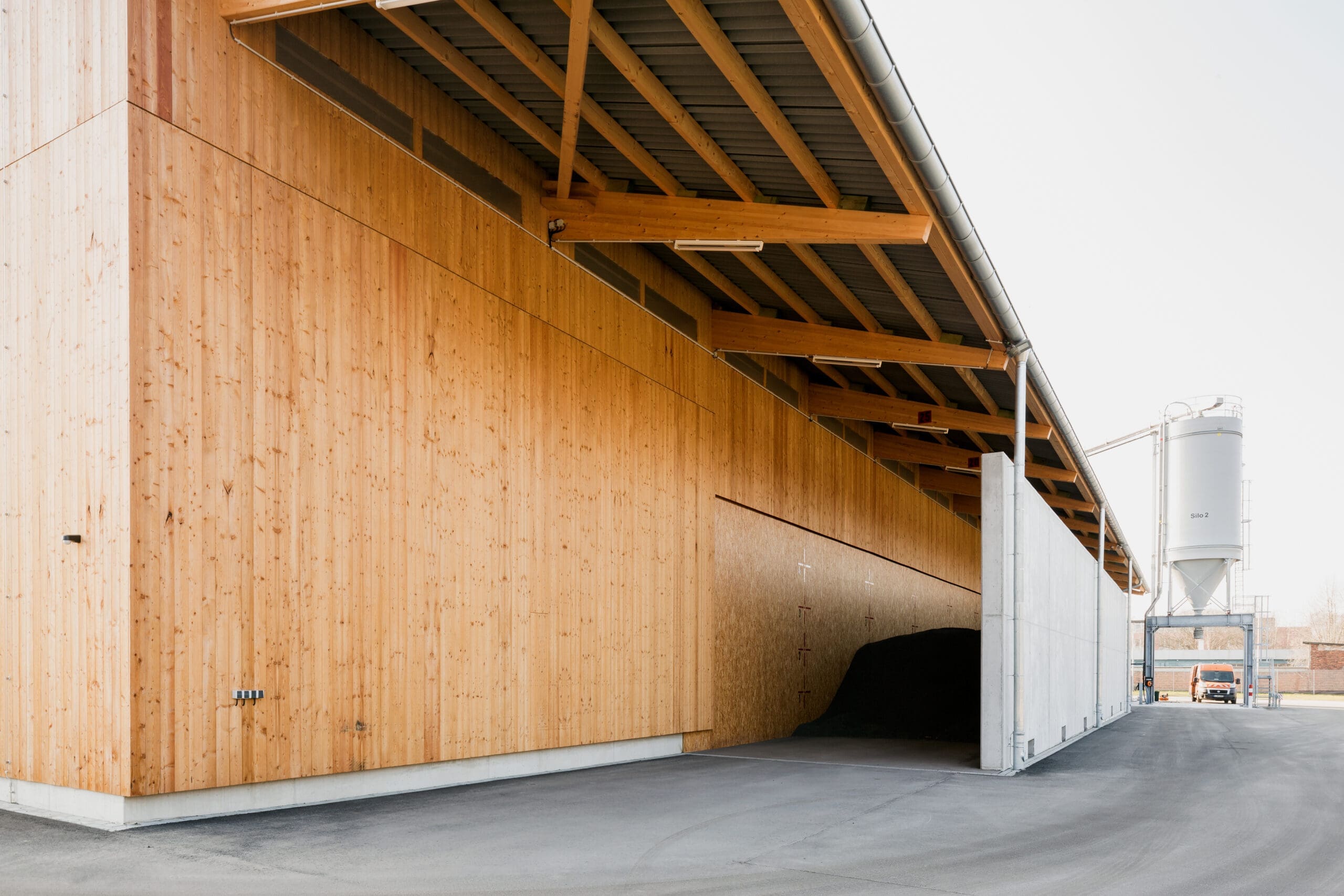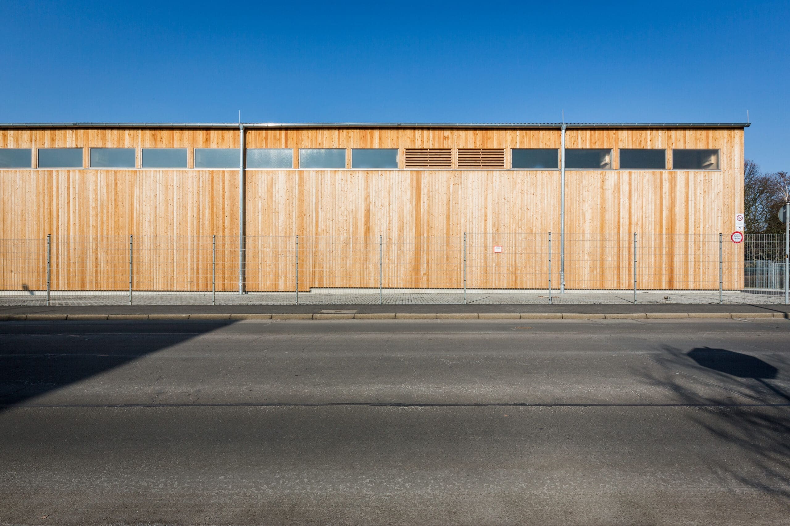 Die eingeschossige Halle wird als Holzkonstruktion mit Leimholzstützen und –