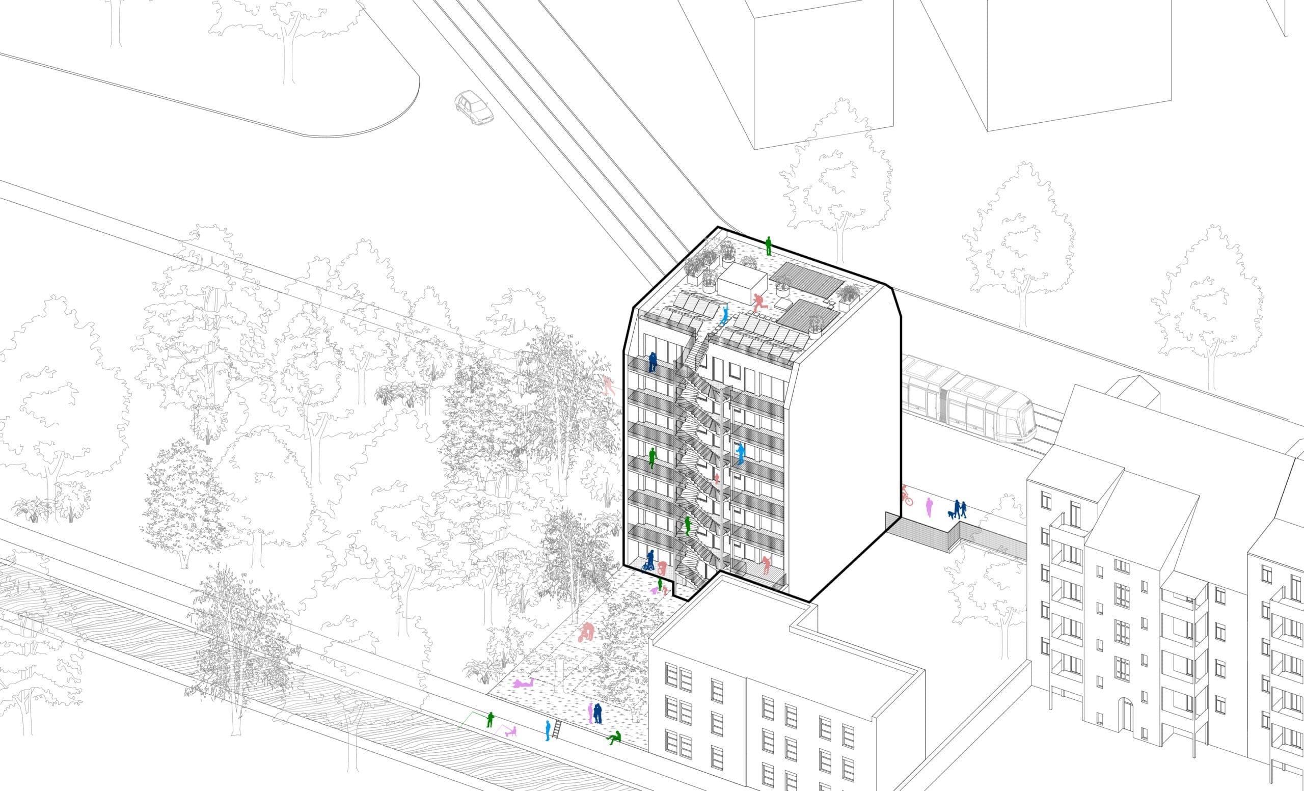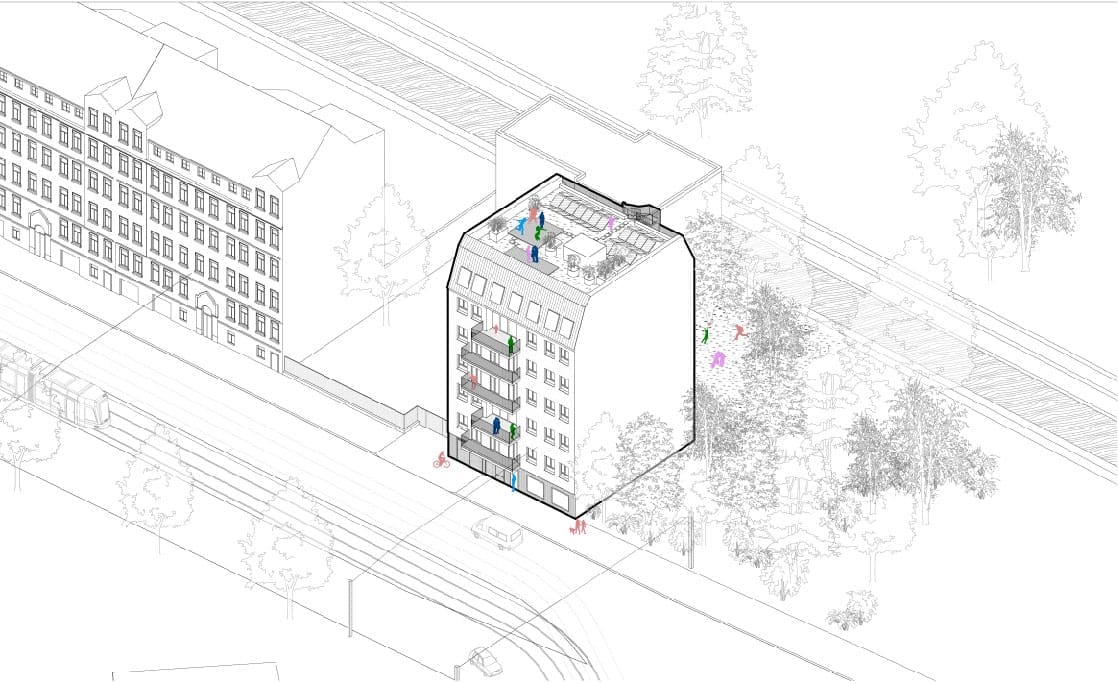 Angefangen bei der Gesellschaftsform der Wohngemeinschaft (als GmbH & Co.KG) in der finanziell schwächere Kommanditist:innen durch stärkere getragen werden können – über die ökologische Holzhybridbauweise mit größtmöglichem Anteil an Holzbau als CO2 Speicher – bis hin zur Wärmegewinnung aus erneuerbaren Energien.